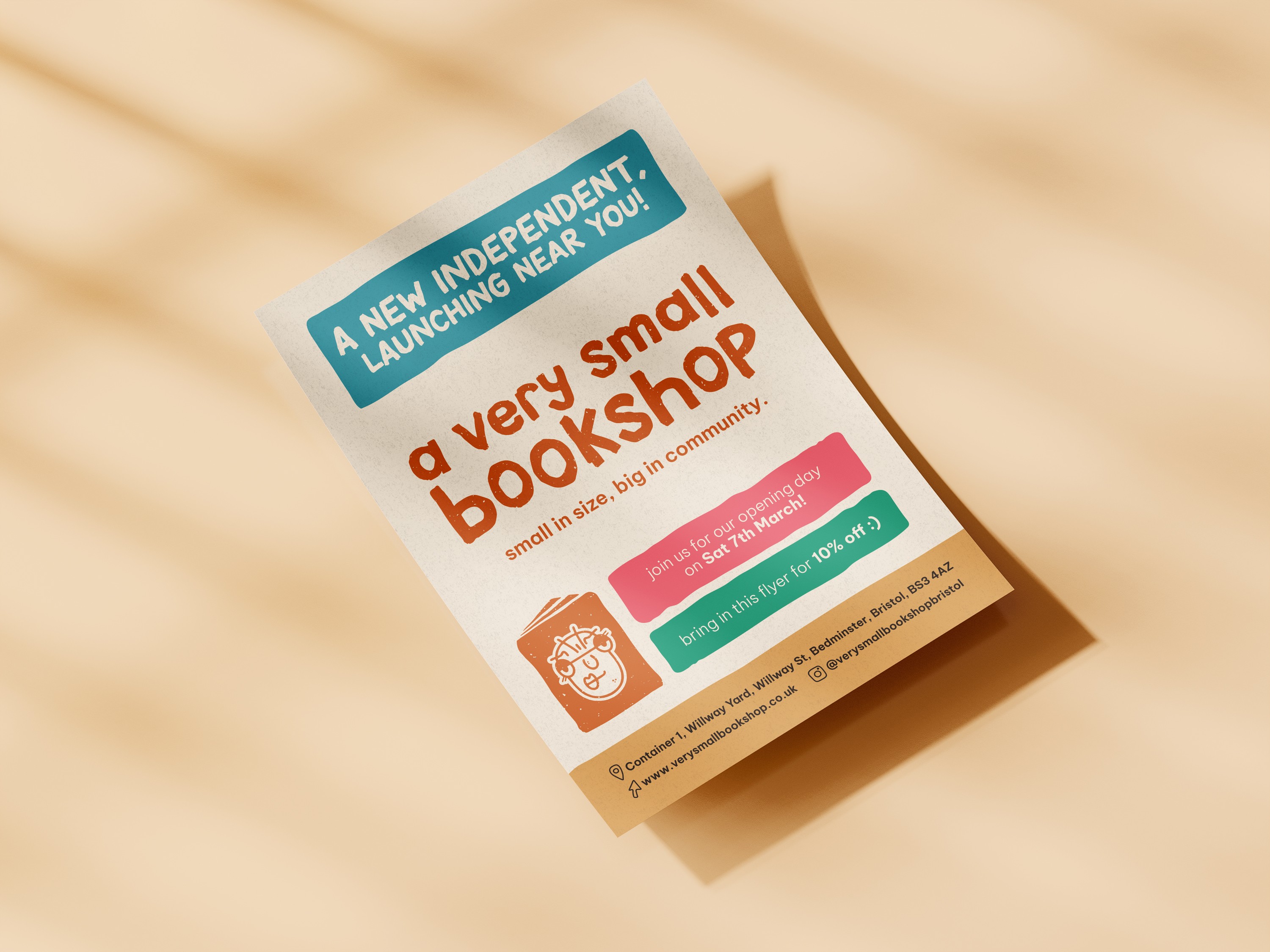 My client Leah had a vision: a bookshop that felt like a safe haven - queer-owned, community-led, and stocked entirely on personal taste rather than sales targets. Operating out of a shipping container yard in Bristol, A Very Small Bookshop was a brand new business with a big personality waiting to be unlocked. Leah needed a full visual identity and a suite of launch materials to bring it to life from scratch.