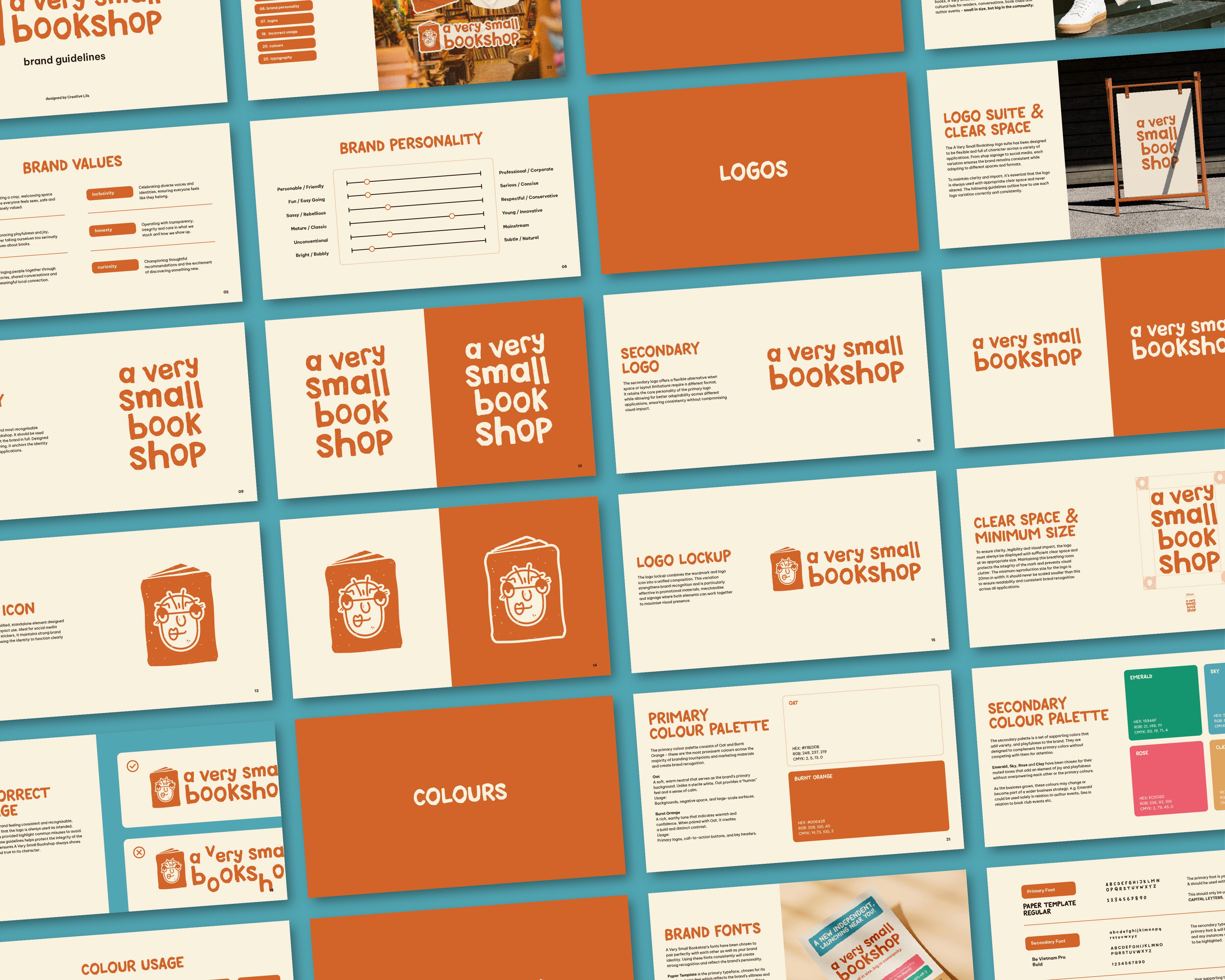 Colour played a huge role in communicating A Very Small Bookshop's two core brand values: warmth and silliness. A natural oat paired with deep burnt orange formed the primary palette, grounded and inviting. A secondary palette of pink, blue, green and sand sits alongside it - designed to use sparingly, but ready to add a pop of joy wherever it's needed.